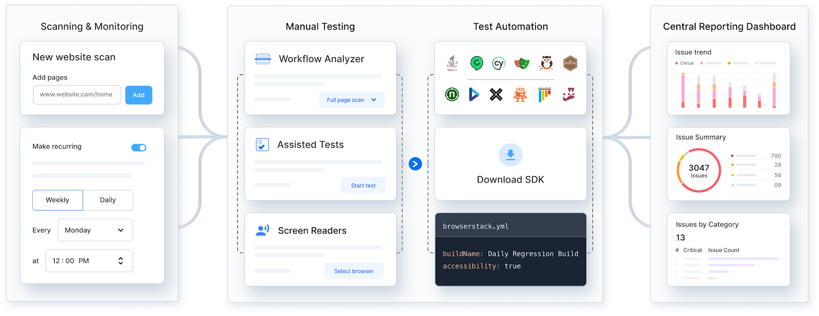 - Enables scheduling of scans, manual testing walkthroughs, and integration into automated suites using BrowserStack SDK.