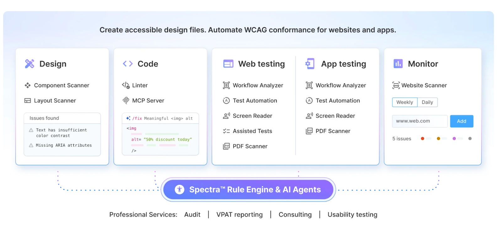 - Spectra™ Rule Engine: Offers comprehensive, automated coverage of WCAG criteria; deduplicating and grouping issues with AI-powered guidance.