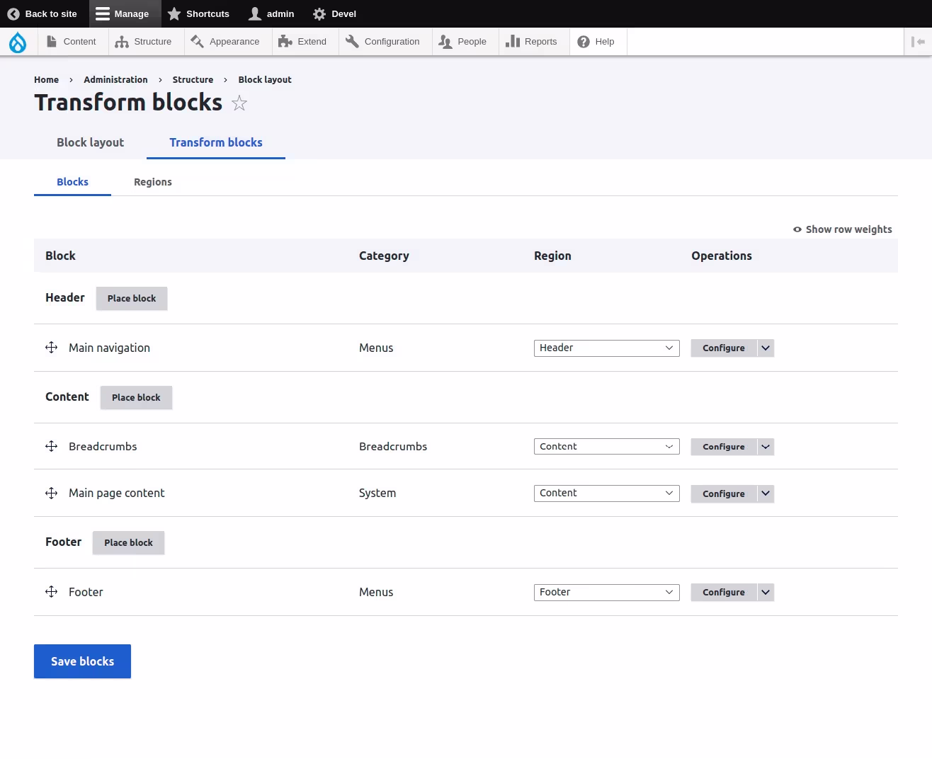 The Transform API includes a new Transform blocks tab (/admin/structure/block/transform ) within Drupal's main block layout settings page. Here, regions and blocks can be configured for the JSON output. These Transform blocks work similarly to regular blocks, except they use preconfigured regions rather than theme regions.